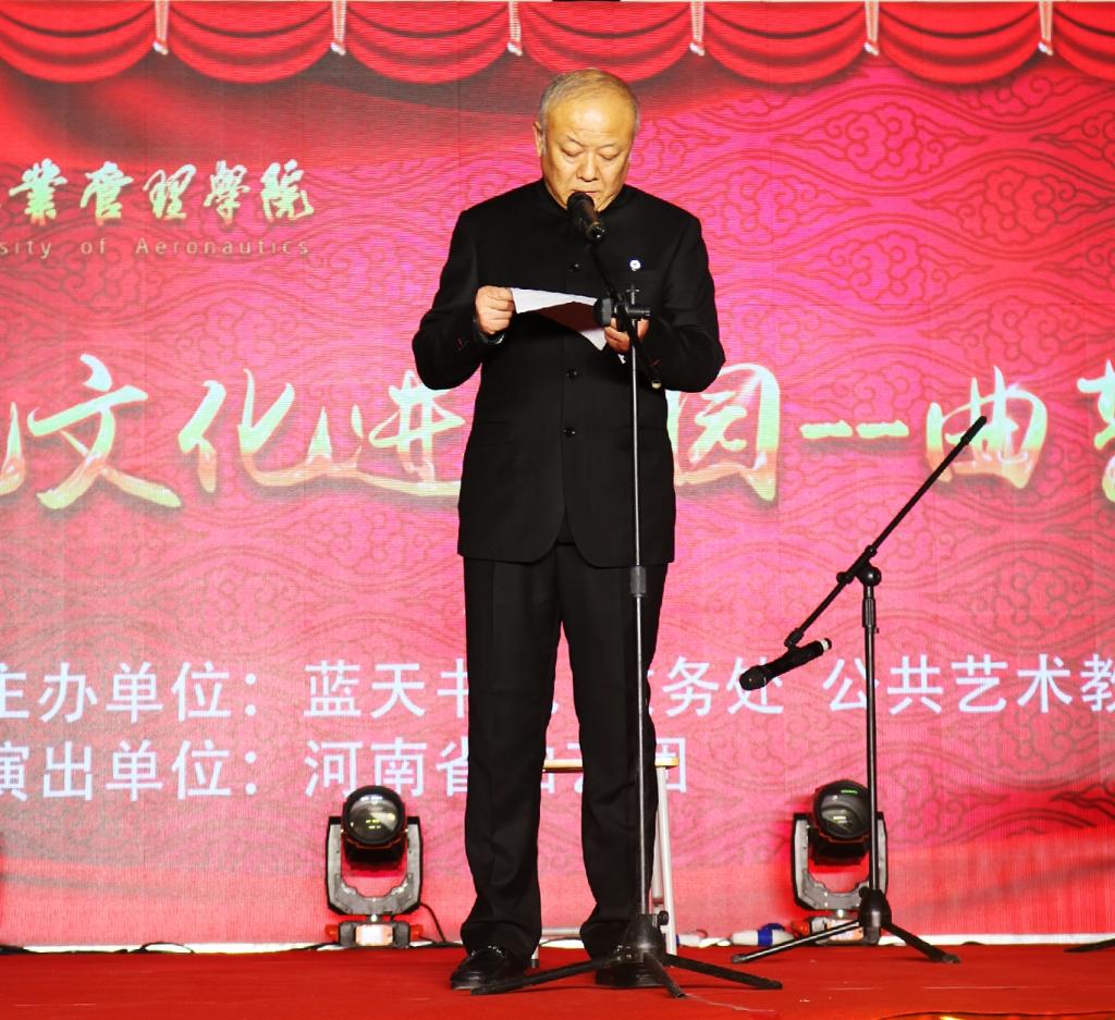 演出前,副院长李陶然代表学校对艺术家们表示由衷感谢。他指出,时值我校建校69周年,举办传统文化进校园活动是校庆系列活动之一,旨在发挥学校文化传承职能,传承和弘扬中华传统文化艺术,以艺术教育的形式开展美育和素质教育,提高大学生艺术修养,提升校园文化氛围。