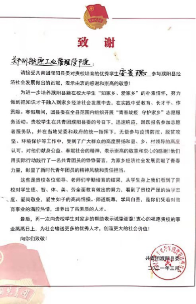 “贵校学生安贵璐在共青团濮阳县委的号召下,迅速响应,踊跃报名参加志愿者服务队,并在当地党委和政府的统一指挥下,无偿参与疫情防控、脱贫攻坚、环境保护等工作中……”近日,我校信息管理学院收到一封由共青团濮阳委员会寄来的感谢信,感谢我校安贵璐同学在寒假社会实践活动中的突出表现。