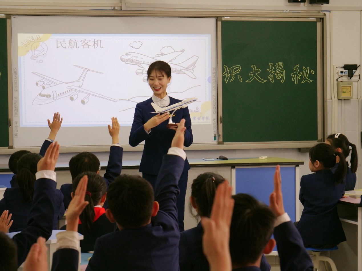 在首场航空科普课堂上,我校大学生志愿者为小学生们带来了精彩的民航知识科普课堂,深入浅出地讲解了机组的组成、空中乘务员的职责以及民航礼仪等民航知识。志愿者老师通过真实案例、互动交流等方式使学生们了解民航机场、客机的基本知识,熟悉乘机流程和机上基本礼仪,实现了航空知识与生活实践的有机融合。