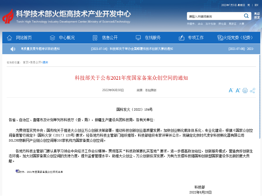 近日,科技部发布《关于公布2021年度国家备案众创空间的通知》(国科发火〔2022〕184号),全国共计350家众创空间获批国家级众创空间备案,我校“郑航众创空间”成功入选,纳入国家级科技企业孵化器管理服务体系。