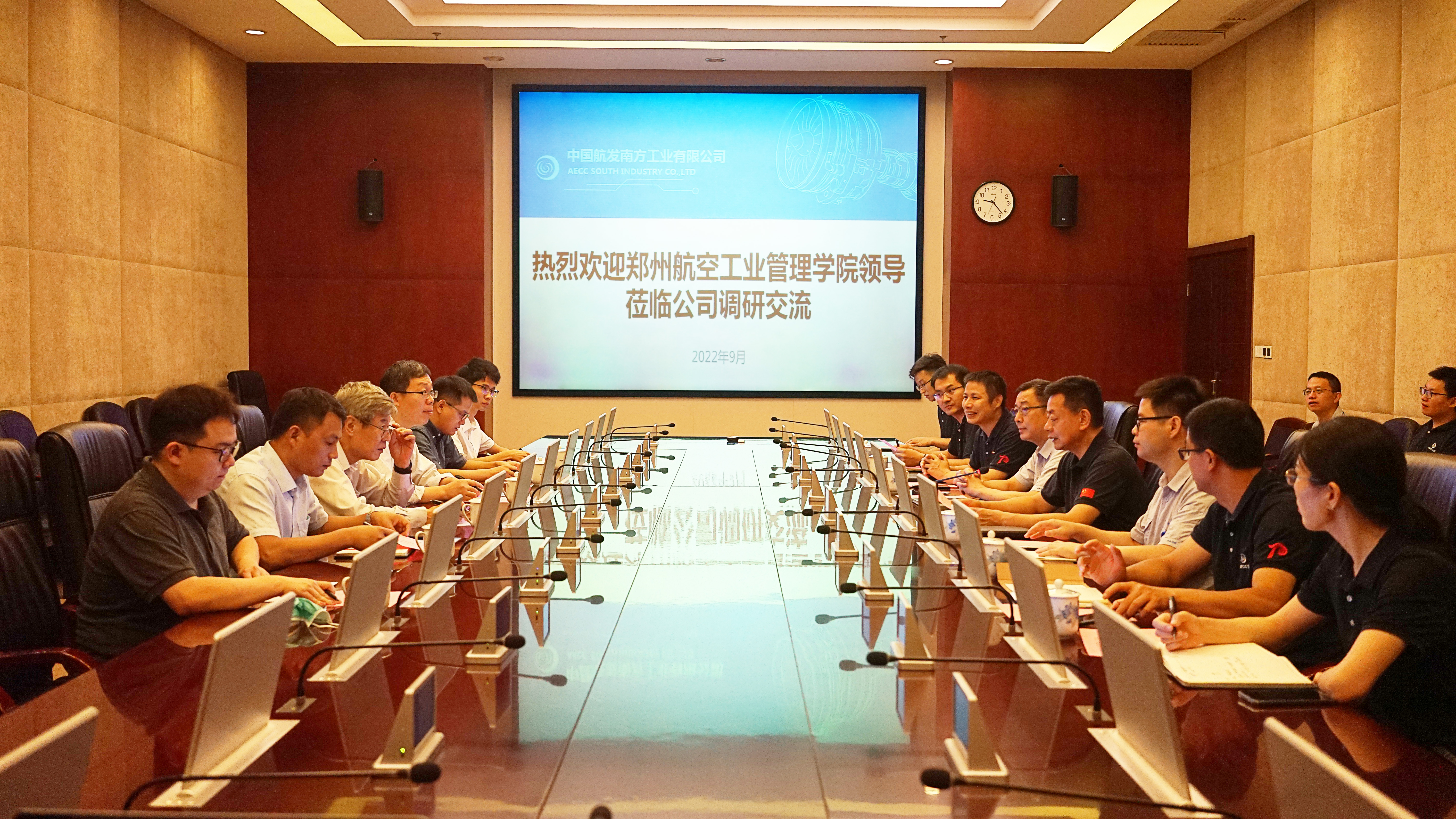 在中国航发南方公司,费斌军一行实地参观了公司生产线并参加座谈会。座谈会上,双方就人才培养、科研交流、人员挂职锻炼及下一步合作方向等情况进行深入交流。南方公司总经理、党委副书记王南海表示,近年来郑州航院为企业输送了大量技术和管理人才,为企业发展贡献了重要力量。他希望,双方进一步深化合作,推动航空发动机领域产学研深度融合,共同构筑航空发动机专业人才培养高地,为航空事业高质量发展提供有力的人才支撑。费斌军表示,南方公司历史底蕴深厚,七十余年来为国防装备发展作出了突出贡献,希望双方抢抓产业发展机遇,在人才交流、课题攻关、实践教学等方面加大共建力度,推进校企深度合作与发展,共同为航空发动机事业发展贡献力量。