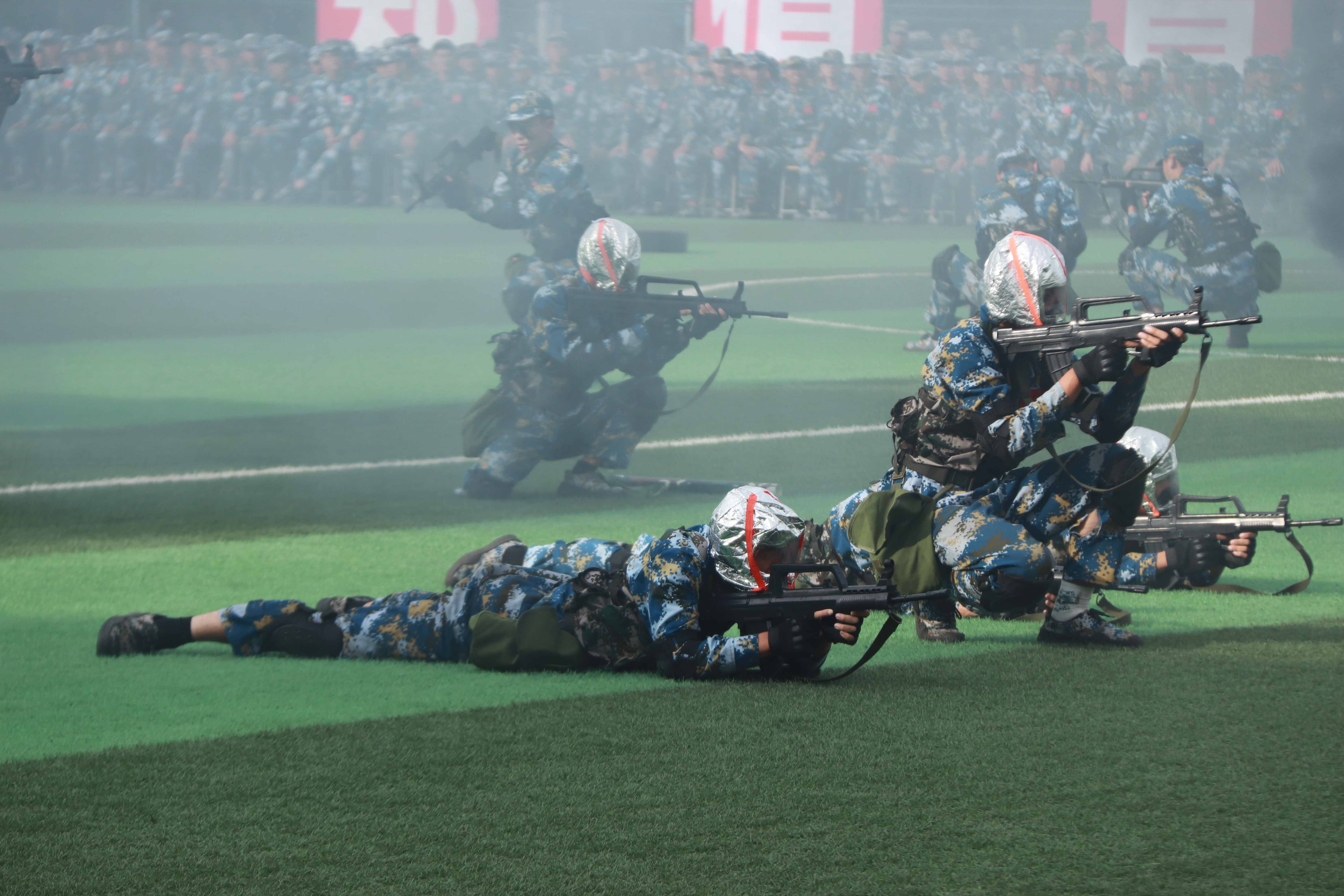 在成果汇报展演中,刺杀操、应急棍术、盾牌术、匕首操、军体拳、战场演练等科目表演依次登场,卧倒、滚翻、搜索前进等单兵技能彰显着青年学子的顽强拼搏,掩护配合、攻防兼备的团队战术更显集体协作的力量。每位训练有素的青年学子,仿佛化身为战场上的勇士,铿锵有力的呼喝和干净利落的拳脚打出了喷薄欲出的气势,令人热血沸腾。