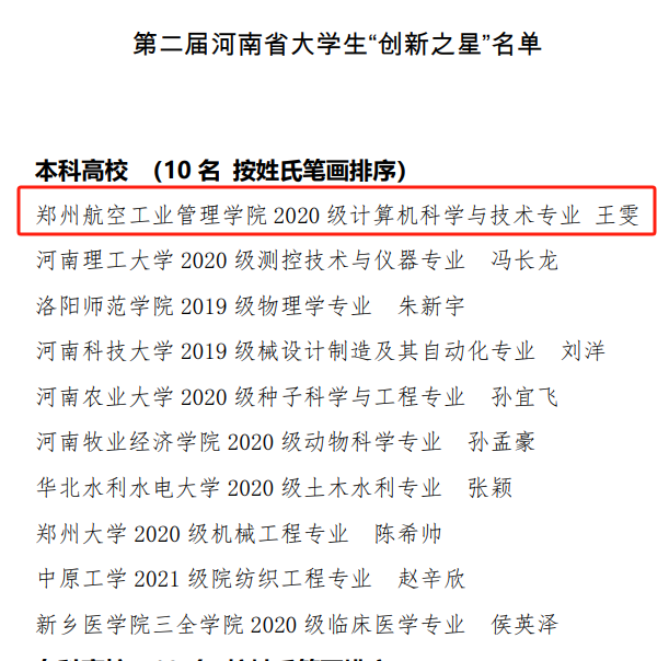 近日,河南省教育厅公布第二届河南省大学生“创新之星”名单,我校智能工程学院2020级计算机科学与技术专业学生王雯成功入选,成为全省本科高校获此殊荣的10名大学生之一。我校学子已连续两届入选河南省大学生“创新之星”。