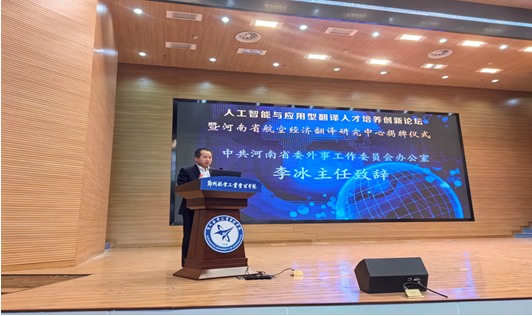 李冰在致辞中指出,2018年以来,为深入学习贯彻习近平外交思想、习近平总书记关于加强和改进国际传播能力重要讲话和视察河南重要指示批示精神,推动落实省委第十一次党代会提出的锚定“两个确保”实施“十大战略”奋斗目标,省委外办强力推进“翻译河南”工程,着力构建河南对外话语体系。在此背景下,培养优秀翻译人才至关重要,既有助于构建新时代河南对外话语体系,也有利于加快河南省全方位走向世界的步伐。当前,人工智能迅速发展,翻译学科、专业及其人才培养面临新挑战新机遇,“人工智能与应用型翻译人才培养创新论坛”的举办,必将为我省中高端应用型翻译人才培养探讨出一条创新之路,必将为未来的翻译研究、翻译实践带来深入思考与启迪。