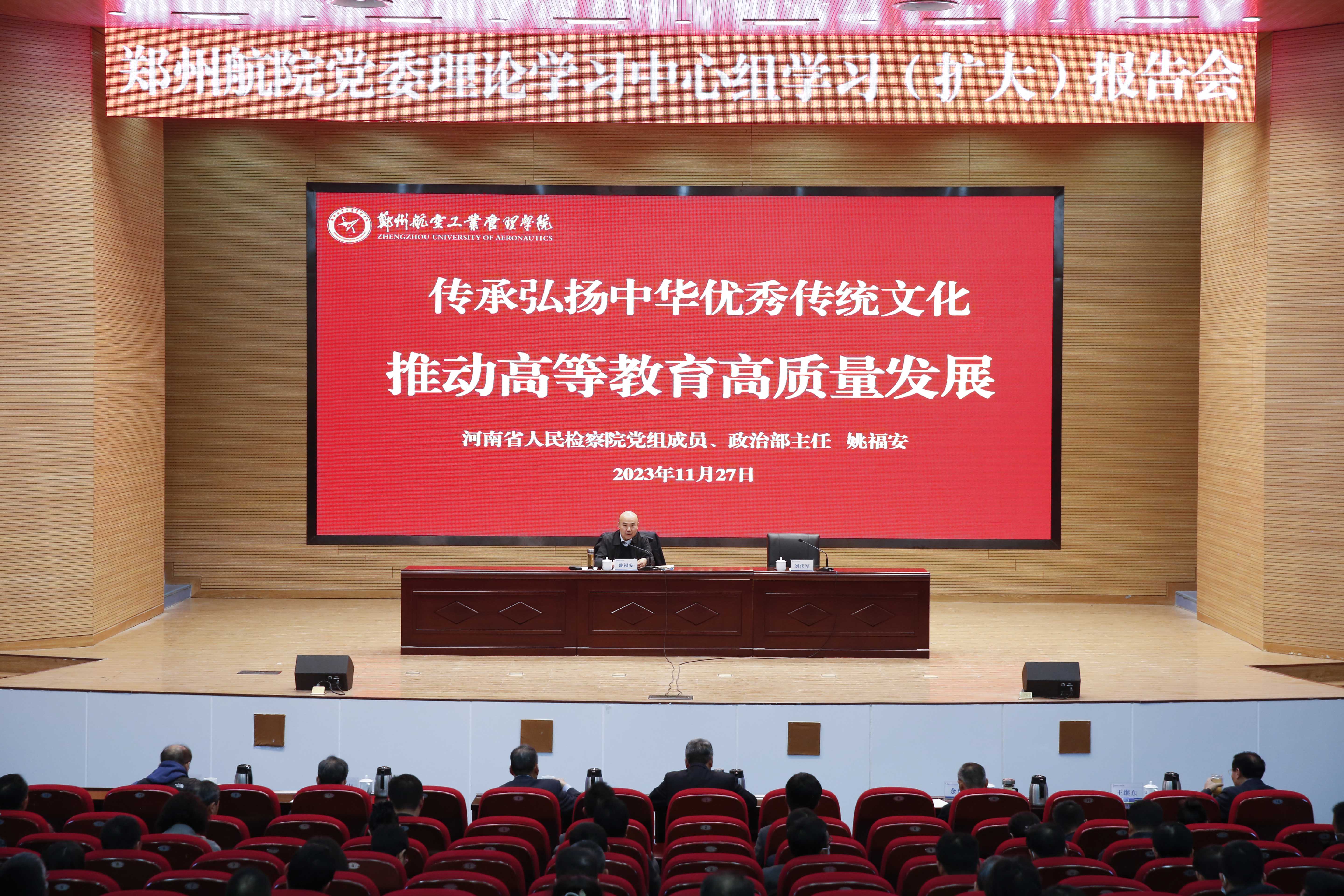 11月27日,校党委召开党委理论学习中心组学习(扩大)报告会,特邀河南省人民检察院党组成员、政治部主任姚福安作专题报告。全体在校校领导出席,党委书记、校长刘代军主持报告会并讲话。
