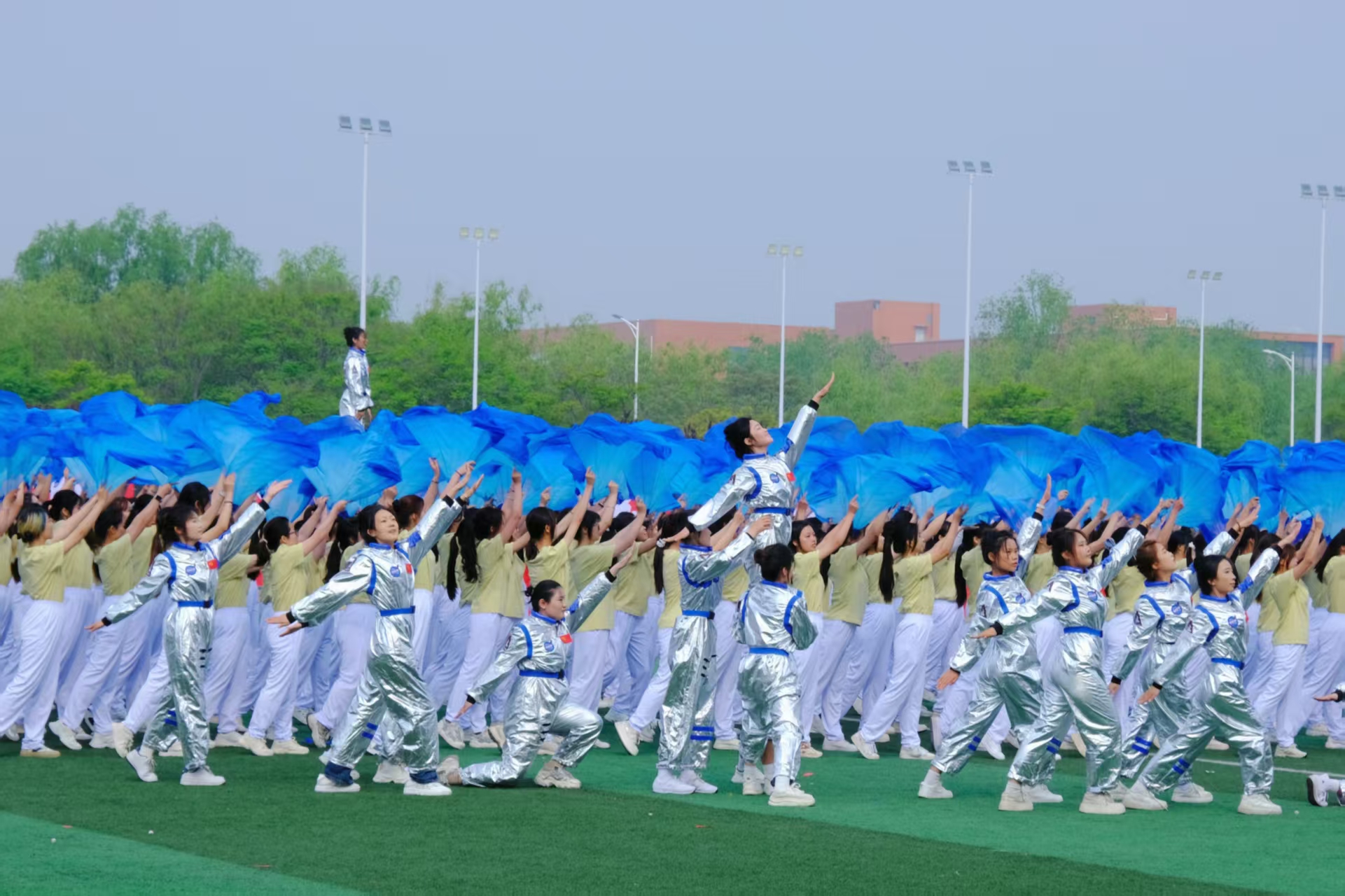 节目展示环节,航模表演率先登场,河南省重竞技航空运动中心航空模型项目团队先后带来线操纵特技飞行、固定翼四机空战、手操遥控滑翔机飞行、直升机遥控花式特技飞行等表演,航模腾空而起,在体育场上空盘旋、俯冲、翻转、追逐,一组组高难度操作干净利落,惊艳全场。多旋翼无人机将“运动激扬青春,奋斗成就梦想”的条幅高高悬起,随风展开,在蓝天映衬下格外醒目。千余名手持彩旗的同学随即奔向操场中央,彩旗翻飞,队列变化,定格为“空天ZUA”字样与一架蓄势起飞的飞机造型。随着场上曲风转换,华尔兹集体舞蹈登场,红裙飞扬,舞步轻盈,为赛场添了几分柔美。压轴的是舞扇团体表演,300名学生挥动蓝色舞扇,扇面开合,层层铺展,如云海翻涌,喝彩声与鼓点声交织,看台上掌声与呐喊声久久不息。