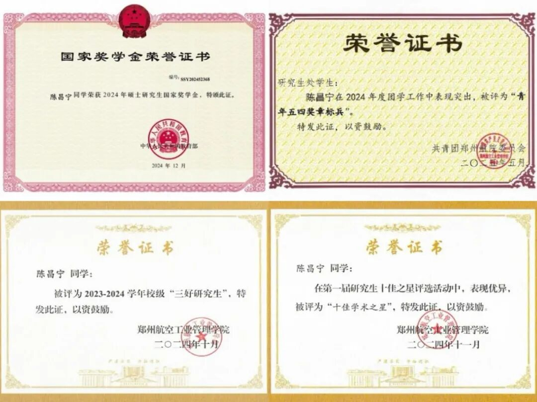 陈昌宁,航空宇航学院2023级硕士研究生。自2021年加入中国共产党以来,他始终以“思想铸魂、行动立身”为准则,自觉发挥党员先锋模范作用。担任学院研究生党支部组织委员后,精心组织“三会一课”、主题党日活动,带领党员赴河南博物院开展“赓续历史文脉,坚定文化自信”主题党日活动。他连续2年民主评议党员为“优秀”等次,荣获校“青年五四奖章标兵”。