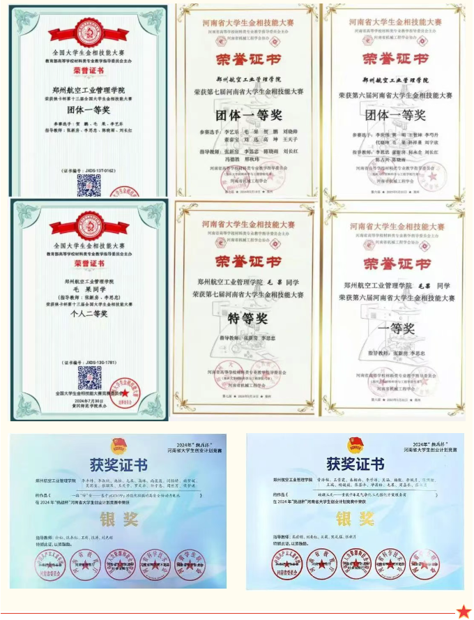 实践创新上,他积极参加科技创新、学科竞赛类活动。曾获第十三届全国大学生金相技能大赛团体一等奖(全国第五名)、第六届河南省大学生金相技能大赛团体一等奖和个人特等奖优异成绩。此外还主持省级大学生创新项目一项(《基于新型电渣重熔技术的GH4096高温合金均匀化热处理及组织调控研究》),斩获多项国家级、省级赛事荣誉,用实力诠释新时代青年党员的奋斗底色。