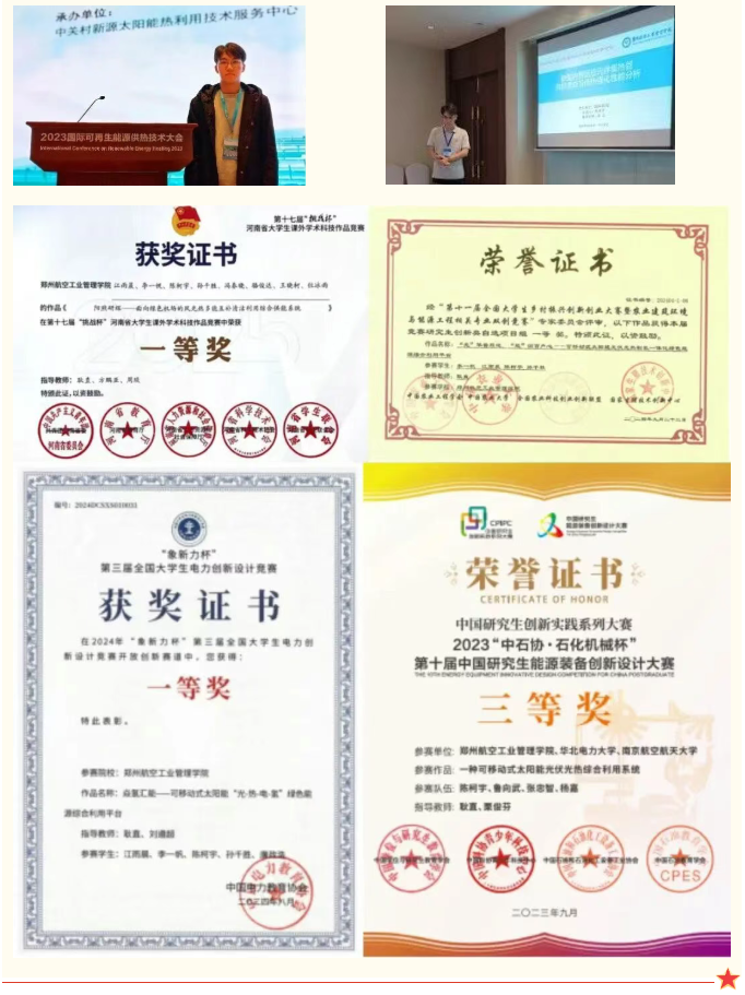 实践创新中,他主动对接行业需求,将创新思维融入实践探索,在科研赛事与学术交流中锤炼本领、成长成才。聚焦能源装备升级、“双碳”目标落地等核心方向,主动投身中国研究生能源装备创新设计大赛、中国研究生“双碳”创新与创意大赛、“挑战杯”河南省大学生课外学术科技作品竞赛、中国国际大学生创新大赛等高水平赛事,累计斩获各级奖项13项。他还注重拓宽学术视野,主动参与国内学术会议及专业培训讲座10余次,在思想碰撞中完善研究方向。他始终以敢闯敢试的劲头深耕创新之路,以笃行实干的姿态赋能专业成长,充分展现了新时代研究生在能源动力与“双碳”领域勇攀高峰、实干担当的青春风采。