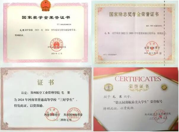 毛果,材料学院2022级本科生。他始终以锤炼“工匠精神”、成为高素质技能人才为目标。学业成绩连续两年位列专业第一,先后荣获国家奖学金、国家励志奖学金,连续两年综合测评成绩专业排名第一,曾获河南省“三好学生”、郑州航院“最美大学生”等多项荣誉。深度参与国家级大学生创新创业训练项目,主持省级大创项目,已发表学术论文3篇。
