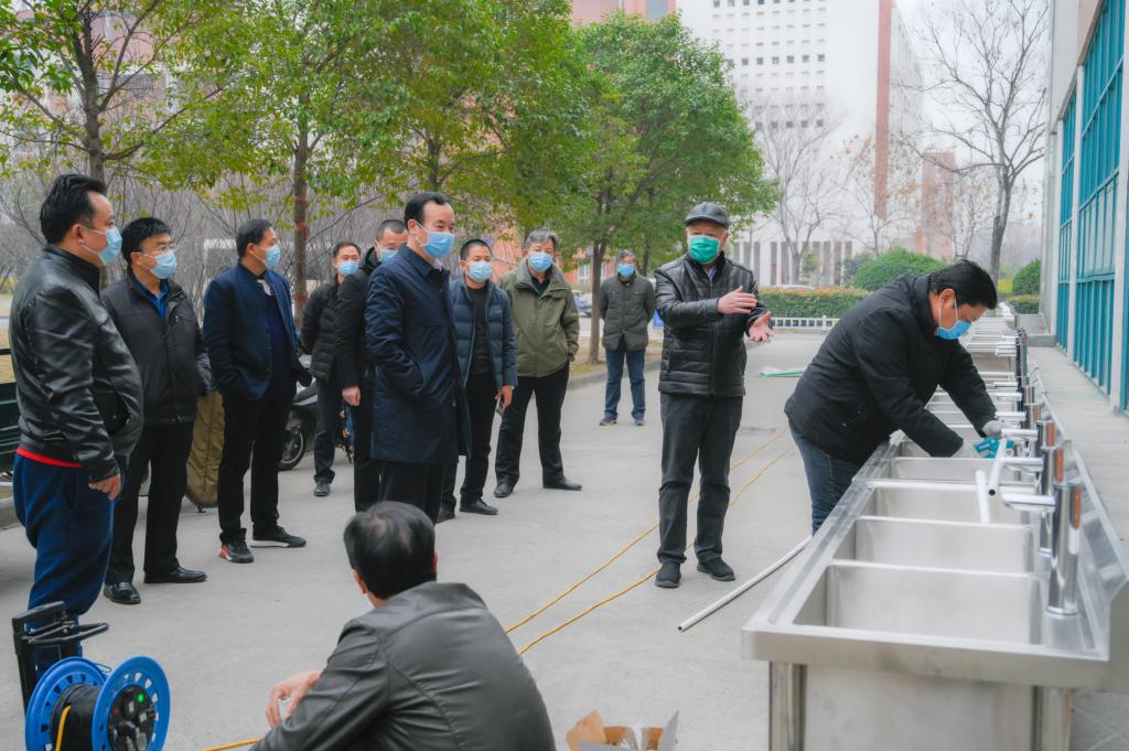 2月24日,校党委书记、学校疫情防控领导小组组长付强先后来到龙子湖校区东苑西苑餐厅、防疫物资储备室、航海路校区郑航宾馆,调研检查餐厅室外洗手池施工情况和发热健康观察区建设工作,并看望居家隔离观察教职工。副院长、学校疫情防控领导小组常务副组长李陶然,党政办、宣传部、后勤管理处主要负责人陪同调研检查。