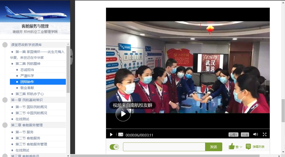 “我们收集了就职于国内各航司的郑航空乘校友‘逆行’武汉、郑航空乘学子游长斌等下沉社区做志愿服务的感人事例,把战疫中涌现的感人事迹作为思政教学案例,有机、有意、有效地纳入课程安排。” 《客舱服务与管理》课程组负责人、民航学院教师谢晓芳介绍说,“使专业教育和价值导向相融共进,将思政教育元素与专业课程知识有机融合,使课堂成为弘扬主旋律、传播正能量的主阵地,充分发挥专业课教书育人的协同作用,引导学生做社会主义核心价值观的坚定信仰者、积极传播者、模范践行者。”