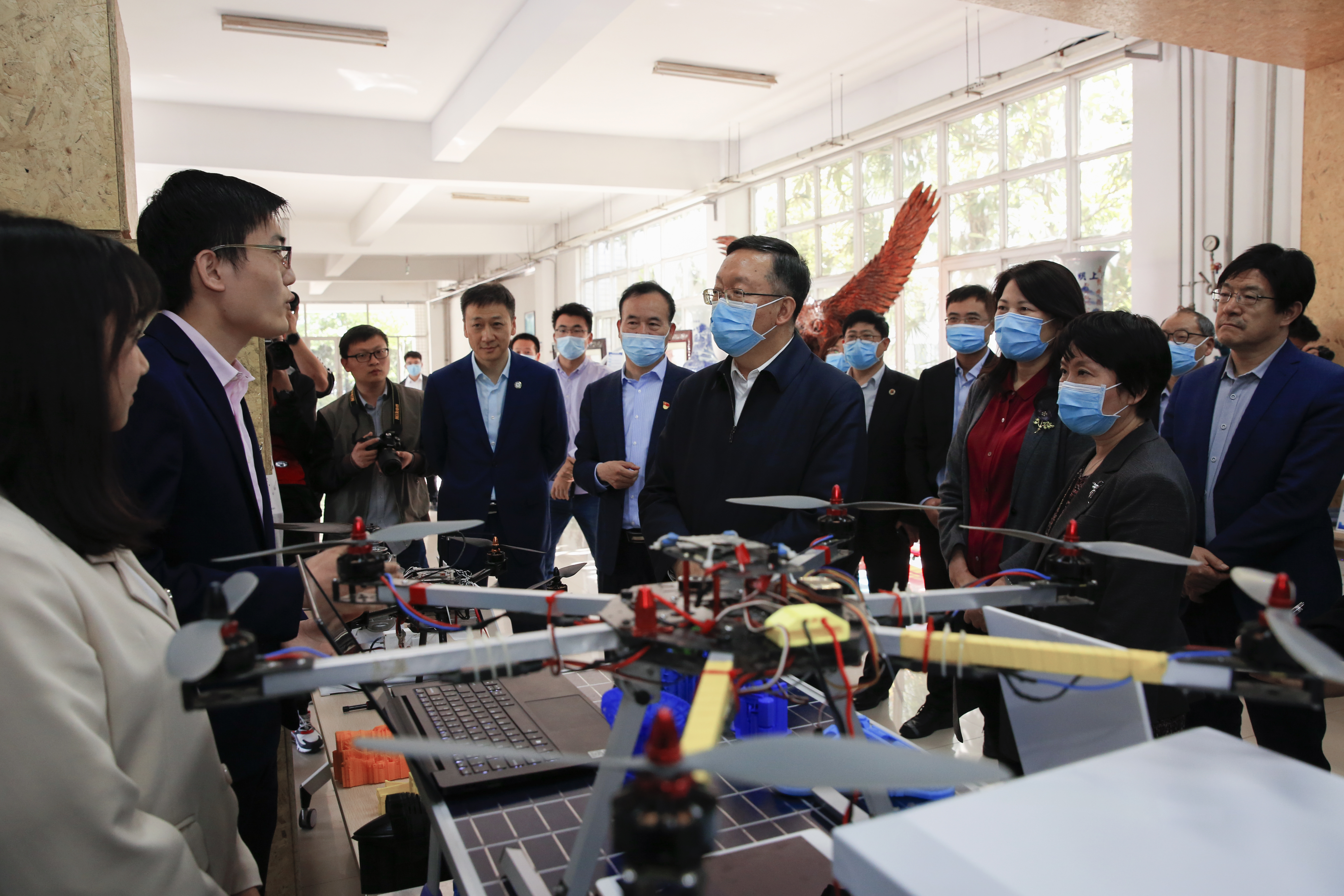 在我校的众创空间,田学军一行调研了创新创业工作的整体情况,重点考察“双创”团队建设和大学生创新创业能力培养,现场查看了光伏无人移动平台、供应链管理3d模型教学教具等师生团队创作的作品。