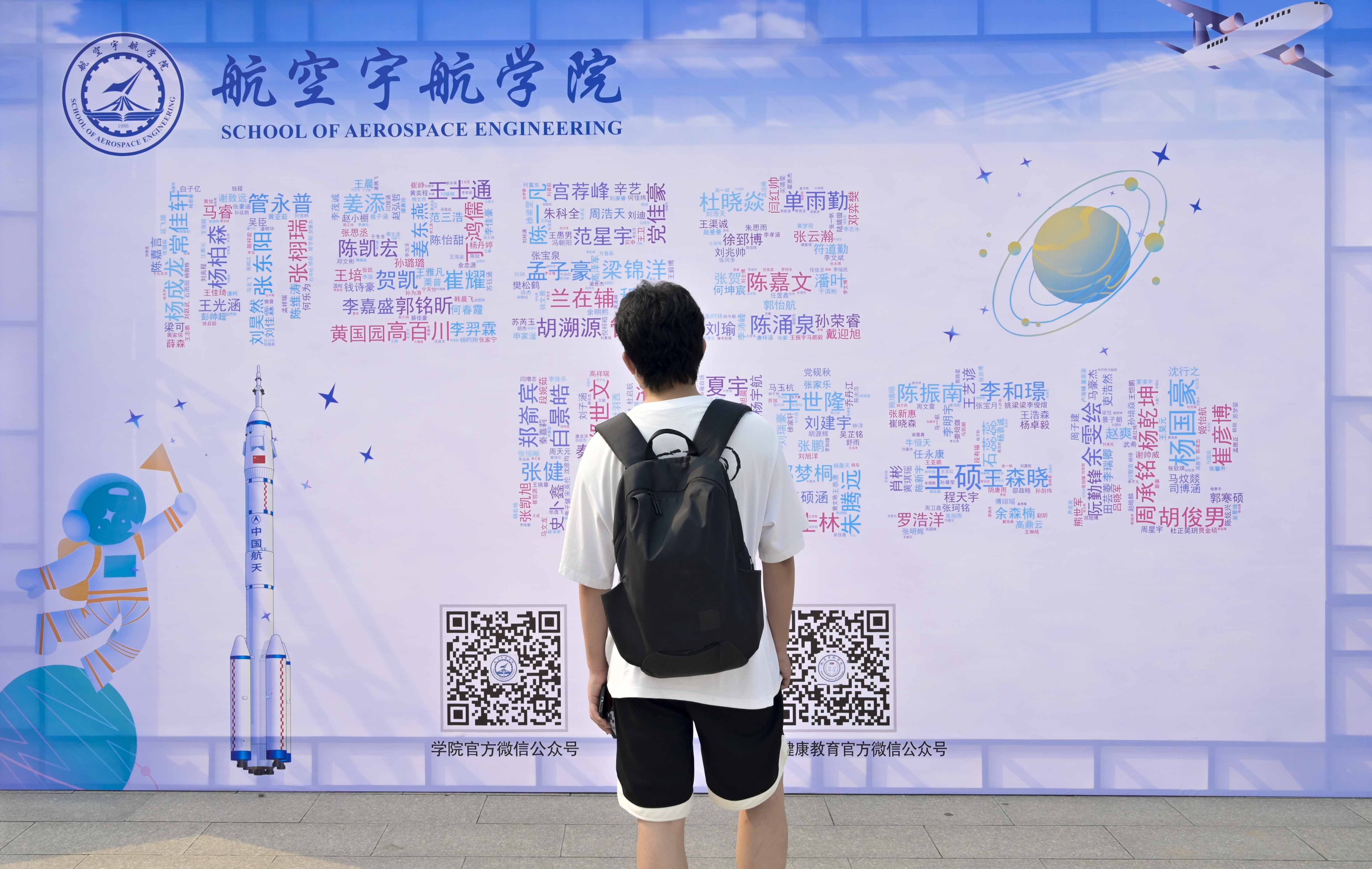 中心广场上,一面印有“仰望星空 脚踏实地”八个大字的大型喷绘打卡墙格外引人注目。走近一看,它是由航空宇航学院604名2022级新生的名字拼成的汉字。“愿2022级航宝们都能有‘仰望星空 脚踏实地’的精神底色。”航空宇航学院辅导员张心怡说。