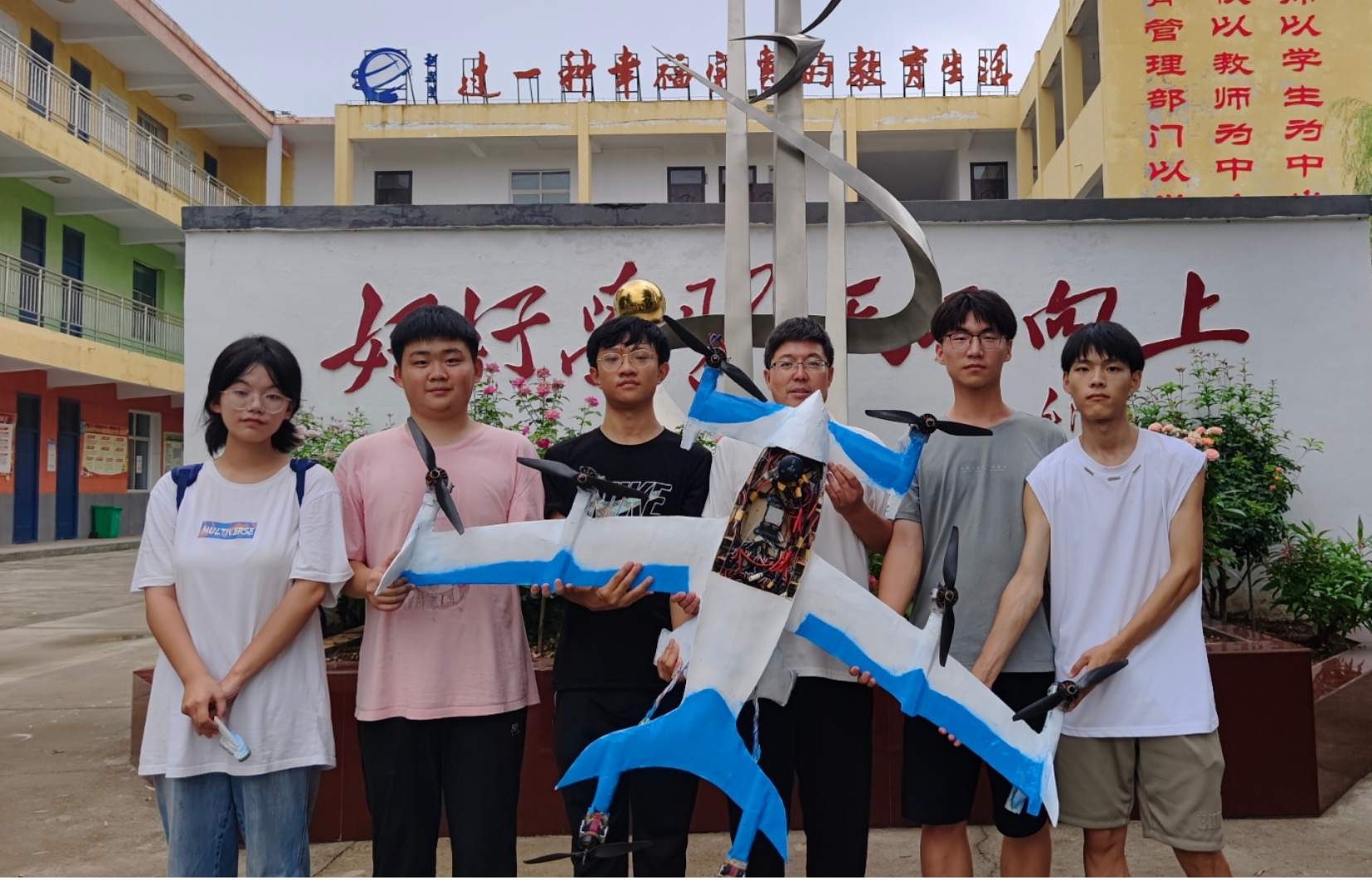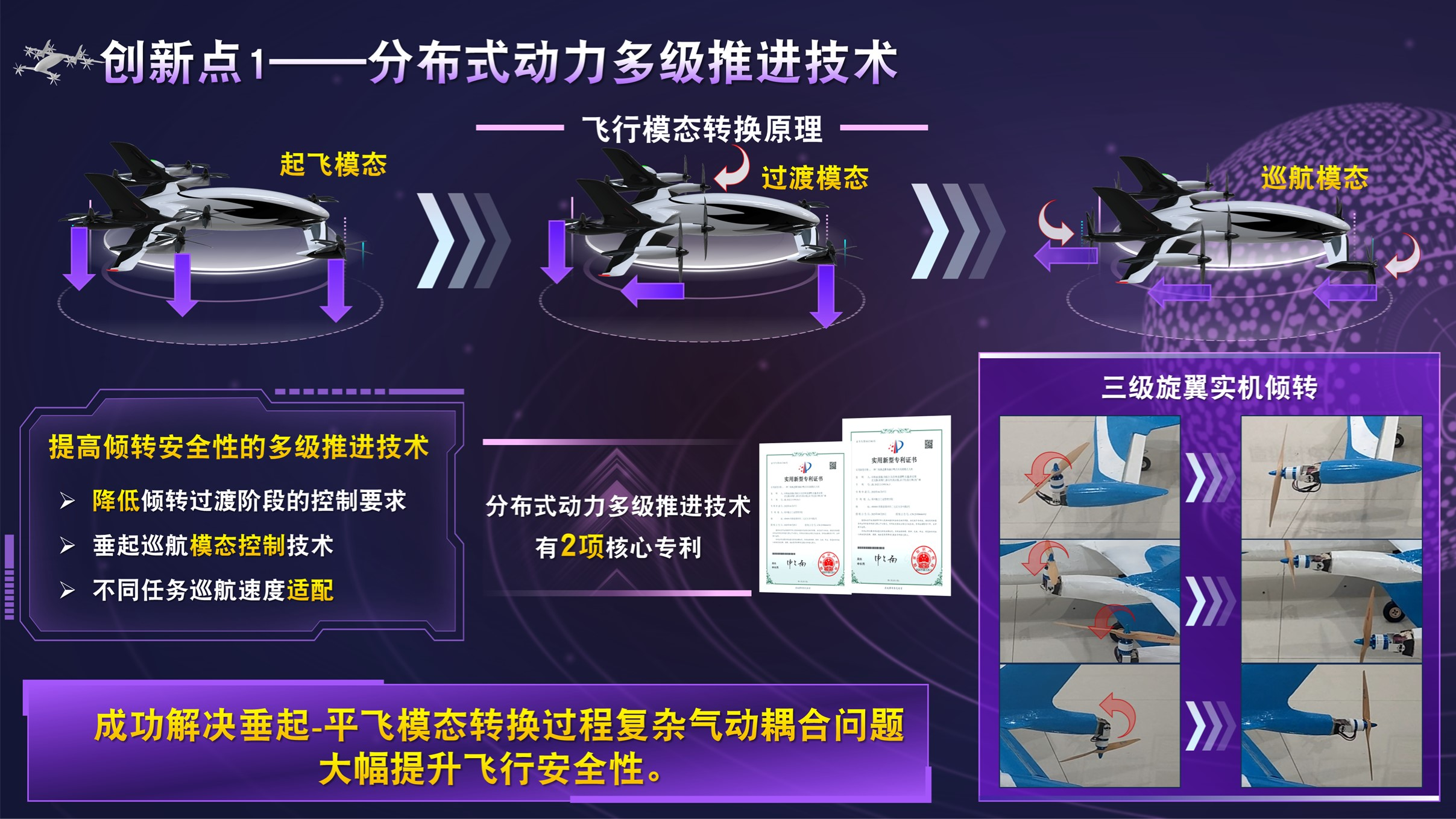 项目简介:结合当前中短距城际、城乡物流运输需求,为解决倾转旋翼无人机垂起转平飞过程中出现的复杂气动耦合现象,尤其是这一过程出现的升力损失、掉高等问题,项目团队提出一种分布式动力多级推进技术,并完成了多轮次飞行测试,证明了提出方案的正确性和有效性。结合鸭式布局、三翼面布局、低阻气动融合式设计、翼身融合设计等,有效降低了气动阻力;采用分级推进系统,减少了复合翼在平飞过程中存在的死重和废阻问题,同时降低了倾转旋翼存在的不稳定问题。设计完成验证机5架,已完成气动性能分析、电控系统调试、垂起测试、平飞测试等多模态飞行试验,授权专利10余项,获中国国际大学生创新大赛河南省赛小组赛第一,全国“彩虹杯”无人飞行器大赛国赛二等奖等。