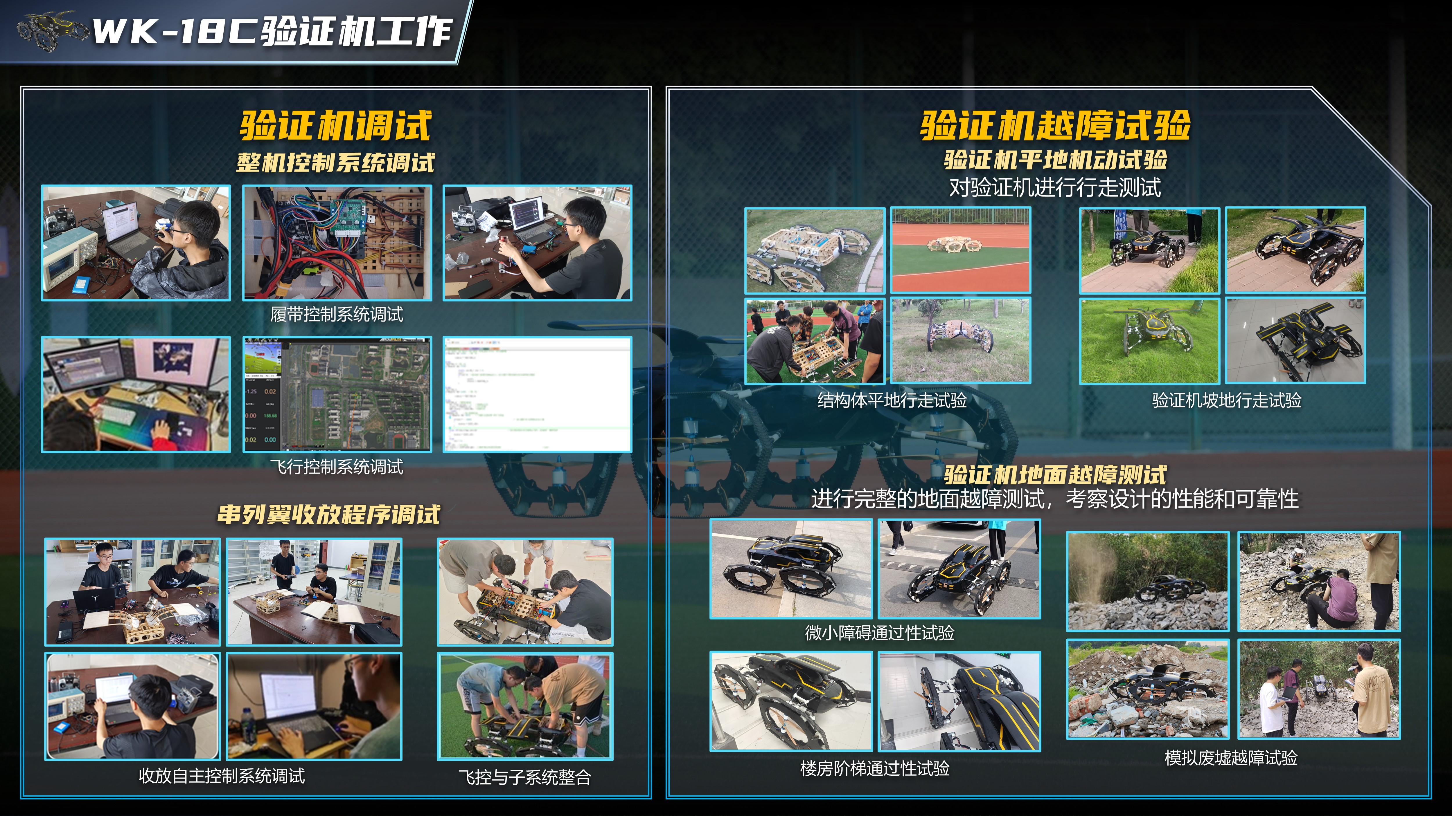 项目简介:针对大型自然灾害快速应急救援中出现的救援时效性差、复杂环境可达性差等痛点问题,项目团队设计并试飞验证了三个创新方案,采用三大创新技术:一是采用多旋翼+固定翼融合设计,实现长续航、可垂起、能耗低、救援快目标;二是采用多旋翼+履带越障车融合设计,解决小型、中型、大型障碍的越障能力问题;三是飞行+履带一体化特种控制系统,可实现地面越障和复合翼飞行控制系统的功能融合,适应多模型任务。项目制作验证机4架,已实现气动性能仿真、飞行测试、地面越障等多种任务场景的飞行试验,授权专利10余项,获航天科技集团、中国航空学会主办的“彩虹杯”无人飞行器大赛全国第一名、国赛特等奖。